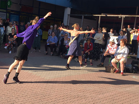 Ruumiillisuutta juhliva esitys Siltamäen ostarilla heinäkuussa 2020