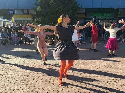 Tanssiteos lihallisuuden riemusta 25:lle tanssijalle Siltamäen ostoskeskuksen pihalla.